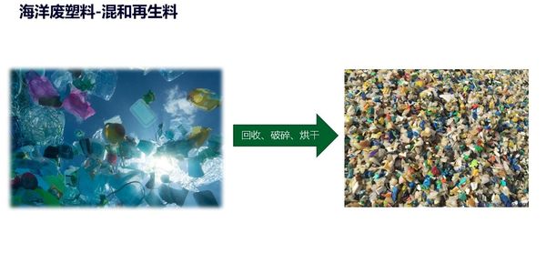 废塑料如是无法分类回收,如塑料复合材料、油墨塑料袋、风力发电废叶片等混和复合材料,透过破碎后制成混和再生料,这种处理后的材料可做为万年木50%原料使用。